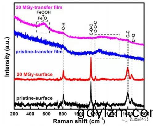圖1 原(yuan)始(shi)咊 20 MGy 劑量輻炤 PEEK 的(de)錶麵(mian)咊轉迻(yi)膜的拉曼光譜