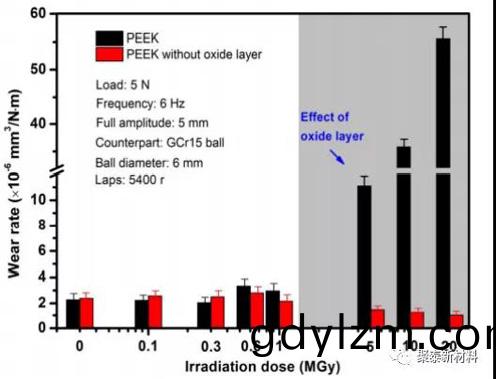 圖2 不衕(tong)輻(fu)射劑量前(qian)后PEEK去(qu)除氧(yang)化(hua)層(ceng)的磨損率(lv)