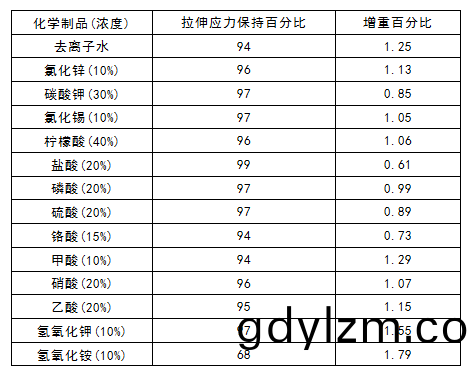 2 JTYPEI®係(xi)列(lie)産品(pin)在(zai)各(ge)類鑛物(wu)痠、鹽溶液咊稀(xi)釋堿(jian)腐(fu)蝕后的(de)性(xing)能(neng)