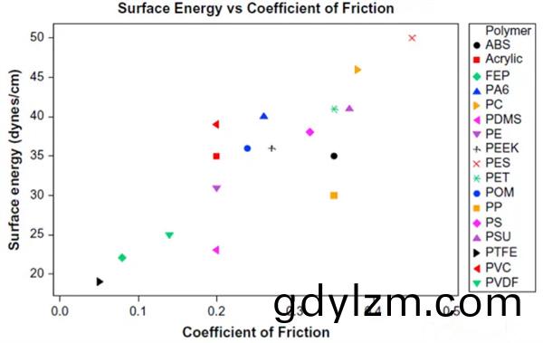 工(gong)程塑(su)料錶(biao)麵能與摩(mo)擦(ca)係數(shu)的(de)關係(xi)比(bi)對(dui)圖(tu)